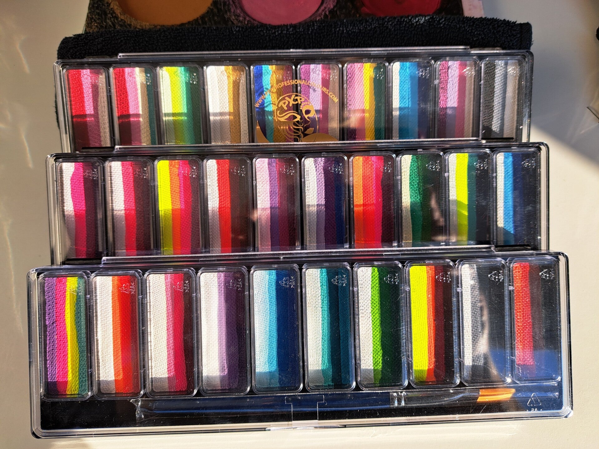 Een palette met alle basis splitcakes die je nodig hebt tijdens het schminken van kinderen. Lange en smalle splitcakes om je penseel makkelijker te laden!